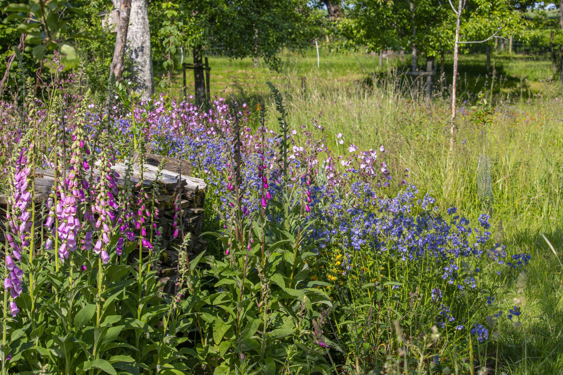 Seit 2015 wurden 6000 qm von einer Weide in einen Naturgarten mit Wiese umgestaltet. Das Gelände ist vielfältig gestaltet mit flachen Bereichen, Hügeln und Teichen, was verschiedene Mikroklimazonen von heiß und trocken bis kühl und feucht schafft – ideale Bedingungen für eine große Pflanzenvielfalt auf der Wiese, in Blühflächen und in den Blumen- und Gemüsebeeten. Neben ein- und zweijährigen Pflanzen sowie Stauden gibt es alte und junge Bäume, Sträucher, Hecken, stehendes und liegendes Totholz, Benjeshecken, Haufen und Abgrenzungen/Mauern aus Altholz und Steinen sowie mehrere Komposthaufen – wichtige Strukturen im Naturgarten. Weitere Bilder, Buch und Blog: katja-falkenburger.de